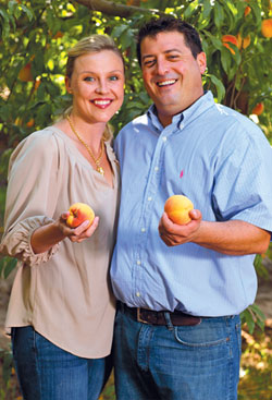Fourth-generation farmer Justin Micheli and his wife Candice grow cling peaches in Sutter County. This firmer variety of peach is typically canned, jarred or packed into kid-friendly fruit cups.