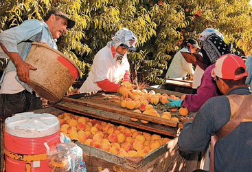 California's crop of cling peaches is hand-harvested from June to September and then sorted in the orchard.