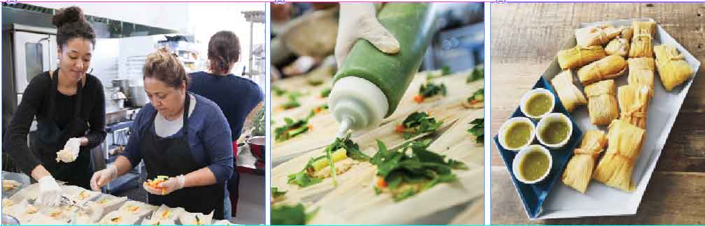Naomi Outlaw, left, and Julieta Vallejo are part of the Flourish Foods team that creates every baby and toddler food item by hand, from scratch. Creative choices such as mini tamales allow toddlers to explore their developing palates. Photos left and center: © 2017 Matt Salvo. Photo right: courtesy Flourish Foods