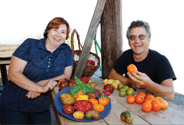 Milt Whaley, owner of Whaley Heirloom Veggies, shares gardening tips and fresh-picked tomatoes with columnist Pat Rubin, left. Whaley grows several hundred varieties of heirloom tomatoes in his Sutter County garden.