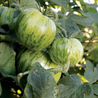 I pore over seed catalogs, mesmerized by the exotic, even frivolous names of heirloom tomatoes. I'm fascinated with the history they bring to the garden. Red Fig, for example, dates back to 18th century American gardens. There's Green Zebra, aptly named for its yellow-streaked green skin. The flavorful yellow orange flesh of Moonglow is almost luminous. Black Russian is a deep mahogany red. Wapsipinicon Peach, named after the Wapsipinicon River in Iowa, has yellowish, fuzzy skin and tastes sweet. Plum Lemon looks more like a lemon than a tomato and Silvery Fir Tree has delicate, carrot-like foliage and flattened fruit. So many shapes, tastes and colors!