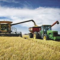 March: In preparation for planting, fields are carefully leveled with GPS-guided equipment. (Flat fields allow rice farmers to conserve water.) Fertilizer is applied, shallow furrows are rolled into the field and 5 inches of water is added.